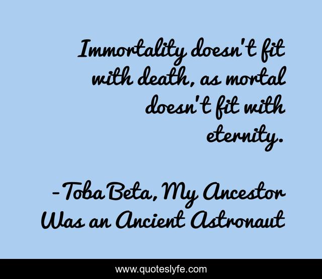 This page presents the quote "Immortality doesn't fit with death, as mortal doesn't fit with eternity.". Author of this quote is Toba Beta, My Ancestor Was an Ancient Astronaut. This quote is about forever, immortal,.
