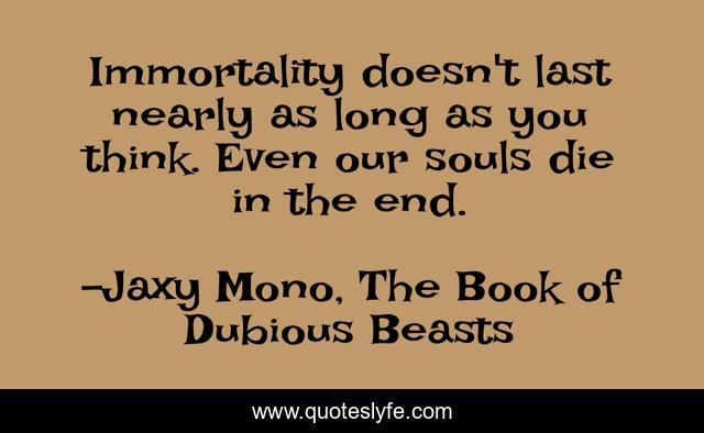 This page presents the quote "Immortality doesn't last nearly as long as you think. Even our souls die in the end.". Author of this quote is Jaxy Mono, The Book of Dubious Beasts. .