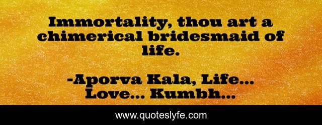 This page presents the quote "Immortality, thou art a chimerical bridesmaid of life.". Author of this quote is Aporva Kala, Life... Love... Kumbh.... This quote is about immortality, spiritual,.