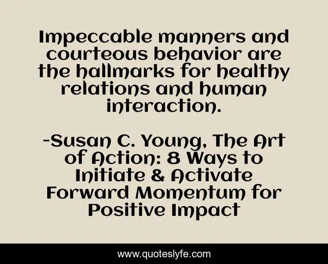 "Susan C. Young, The Art of Action: 8 Ways to Initiate & Activate Forward Momentum for Positive Impact Quotes." Quoteslyfe.com, 2025. Fri. 05 Dec. 2025. <https://www.quoteslyfe.com/quote/Impeccable-manners-and-courteous-behavior-are-the-233468>.