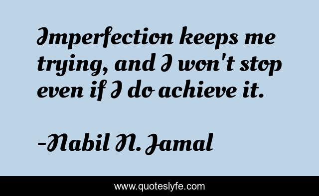 This page presents the quote "Imperfection keeps me trying, and I won't stop even if I do achieve it.". Author of this quote is Nabil N. Jamal. This quote is about even, trying, stop, imperfection, achieve,.