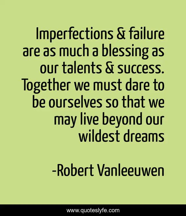 This page presents the quote "Imperfections & failure are as much a blessing as our talents & success. Together we must dare to be ourselves so that we may live beyond our wildest dreams". Author of this quote is Robert Vanleeuwen. This quote is about life, success, hope, motivation, together, understanding, failure, unity, dreams,.