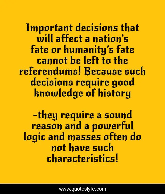 "they require a sound reason and a powerful logic and masses often do not have such characteristics! Quotes." Quoteslyfe.com, 2025. Fri. 05 Dec. 2025. <https://www.quoteslyfe.com/quote/Important-decisions-that-will-affect-a-nation-219066>.