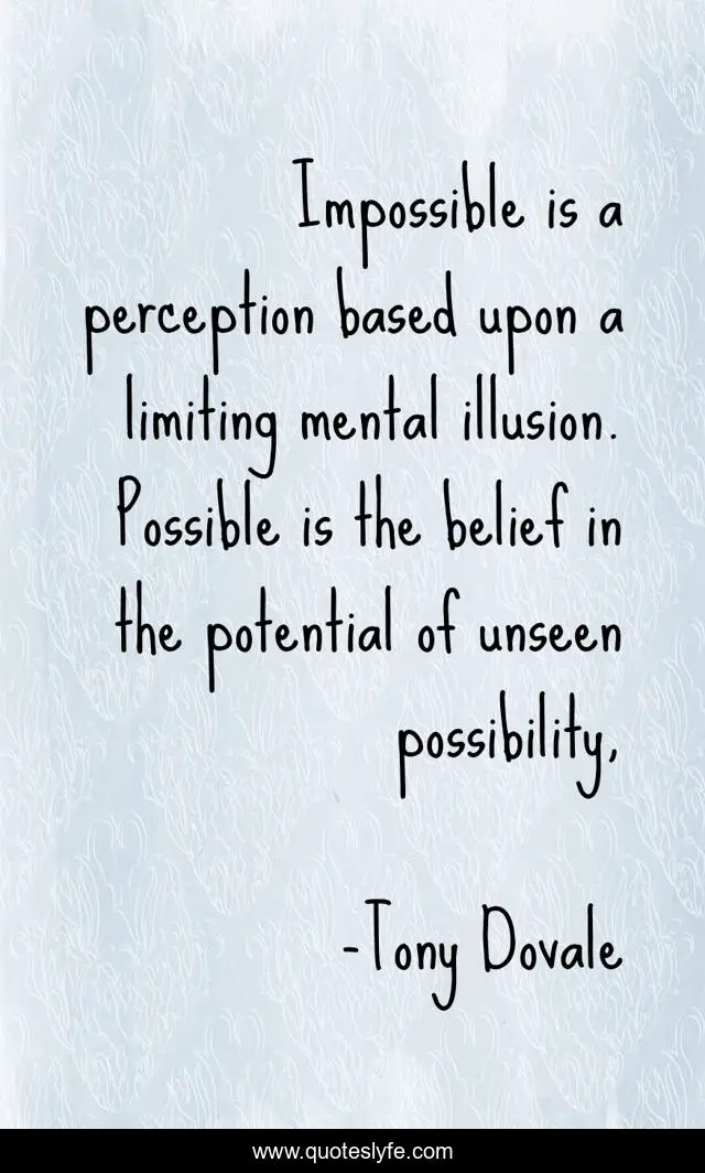 This page presents the quote "Impossible is a perception based upon a limiting mental illusion. Possible is the belief in the potential of unseen possibility, ". Author of this quote is Tony Dovale. This quote is about courageous-mindsets, swift-success, creativity, leadership, innovation, lifemasters, revolutionary-workplace, consciously-constructive,.