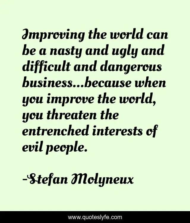 This page presents the quote "Improving the world can be a nasty and ugly and difficult and dangerous business...because when you improve the world, you threaten the entrenched interests of evil people.". Author of this quote is Stefan Molyneux. This quote is about child-abuse, immorality, freedom, philosophy, statism, liberty, progress, ethics, coercion,.