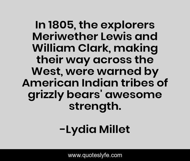 This page presents the quote "In 1805, the explorers Meriwether Lewis and William Clark, making their way across the West, were warned by American Indian tribes of grizzly bears' awesome strength.". Author of this quote is Lydia Millet. This quote is about american, awesome, way,.