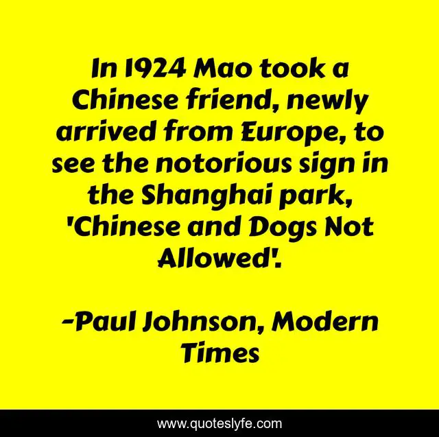 This page presents the quote "In 1924 Mao took a Chinese friend, newly arrived from Europe, to see the notorious sign in the Shanghai park, 'Chinese and Dogs Not Allowed'.". Author of this quote is Paul Johnson, Modern Times. This quote is about imperialism, racism,.