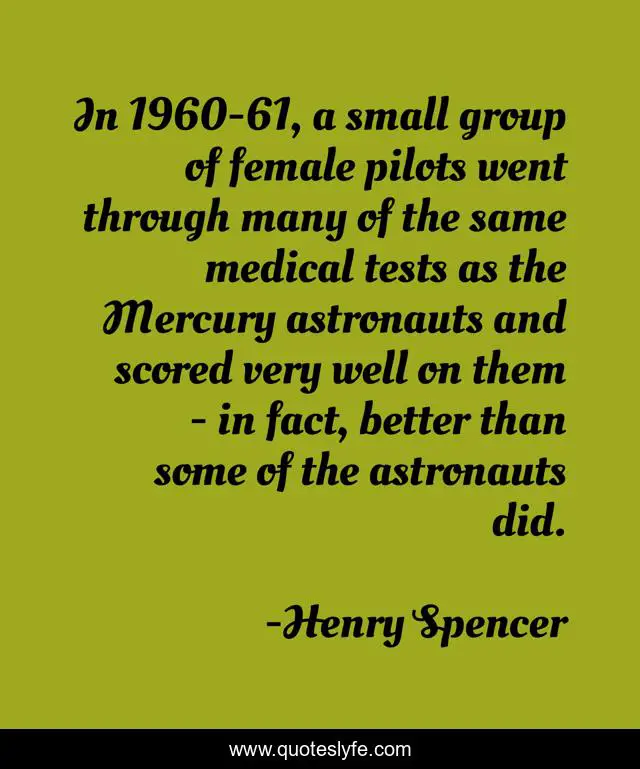 This page presents the quote "In 1960-61, a small group of female pilots went through many of the same medical tests as the Mercury astronauts and scored very well on them - in fact, better than some of the astronauts did.". Author of this quote is Henry Spencer. This quote is about small, better, group,.