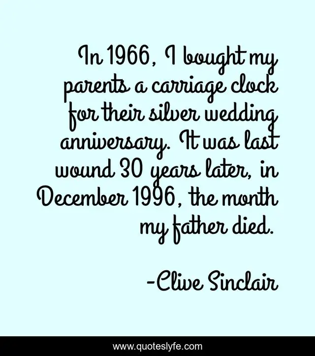This page presents the quote "In 1966, I bought my parents a carriage clock for their silver wedding anniversary. It was last wound 30 years later, in December 1996, the month my father died.". Author of this quote is Clive Sinclair. This quote is about father, parents, wedding,.