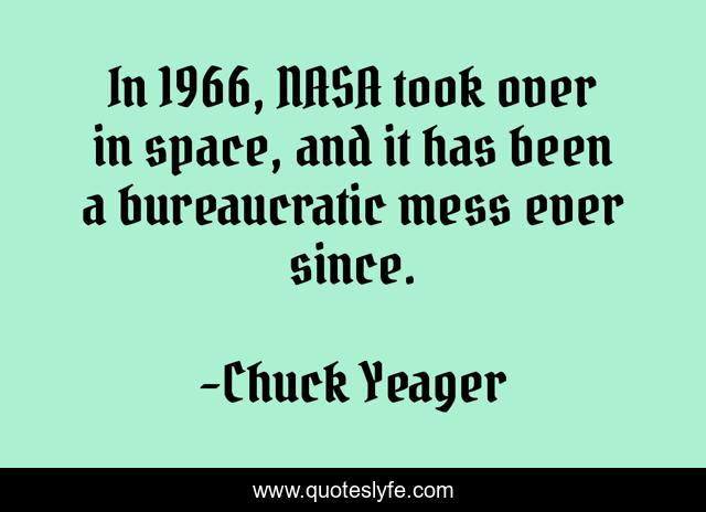 This page presents the quote "In 1966, NASA took over in space, and it has been a bureaucratic mess ever since.". Author of this quote is Chuck Yeager. This quote is about mess, over, nasa,.
