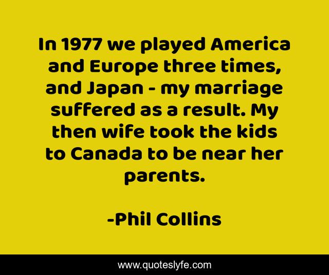 This page presents the quote "In 1977 we played America and Europe three times, and Japan - my marriage suffered as a result. My then wife took the kids to Canada to be near her parents.". Author of this quote is Phil Collins. This quote is about america, parents, wife,.