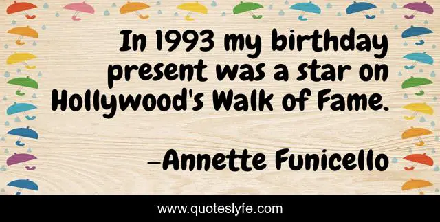 This page presents the quote "In 1993 my birthday present was a star on Hollywood's Walk of Fame.". Author of this quote is Annette Funicello. This quote is about fame, present, walk,.