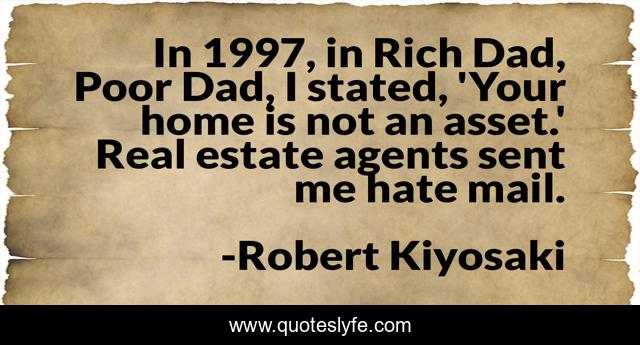 This page presents the quote "In 1997, in Rich Dad, Poor Dad, I stated, 'Your home is not an asset.' Real estate agents sent me hate mail.". Author of this quote is Robert Kiyosaki. This quote is about home, hate, real estate,.