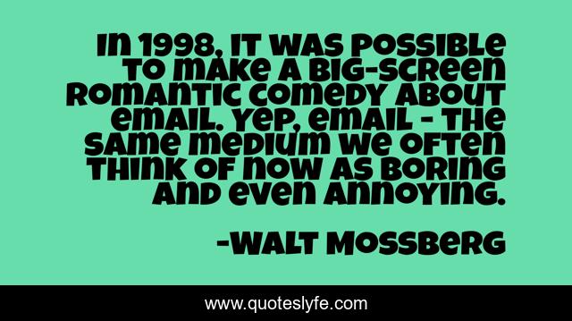 This page presents the quote "In 1998, it was possible to make a big-screen romantic comedy about email. Yep, email - the same medium we often think of now as boring and even annoying.". Author of this quote is Walt Mossberg. This quote is about boring, comedy, think,.