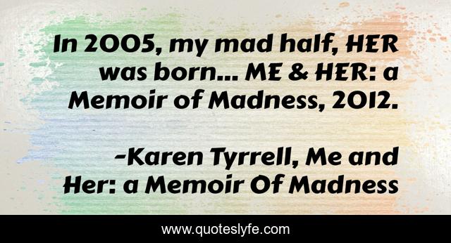 This page presents the quote "In 2005, my mad half, HER was born... ME & HER: a Memoir of Madness, 2012.". Author of this quote is Karen Tyrrell, Me and Her: a Memoir Of Madness. .