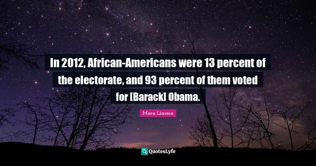 This page presents the quote "In 2012, African-Americans were 13 percent of the electorate, and 93 percent of them voted for [Barack] Obama.". Author of this quote is Mara Liasson. This quote is about percent, electorate, barack, african american,.