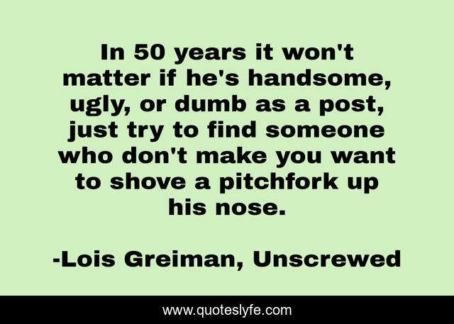 This page presents the quote "In 50 years it won't matter if he's handsome, ugly, or dumb as a post, just try to find someone who don't make you want to shove a pitchfork up his nose.". Author of this quote is Lois Greiman, Unscrewed. This quote is about mystery, chick-lit, rumor,.