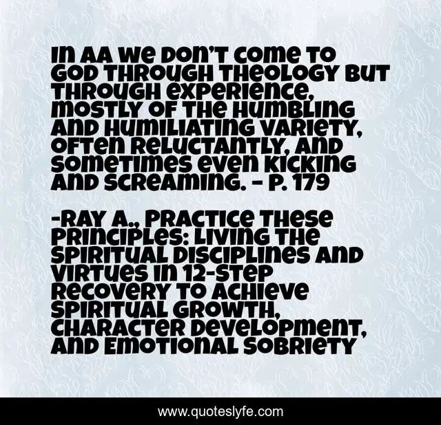 This page presents the quote "In AA we don’t come to God through theology but through experience, mostly of the humbling and humiliating variety, often reluctantly, and sometimes even kicking and screaming. – p. 179". Author of this quote is Ray A., Practice These Principles: Living the Spiritual Disciplines and Virtues in 12-Step Recovery to Achieve Spiritual Growth, Character Development, and Emotional Sobriety. This quote is about experience, theology,.