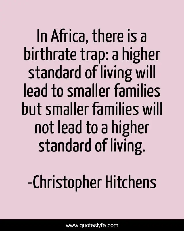 This page presents the quote "In Africa, there is a birthrate trap: a higher standard of living will lead to smaller families but smaller families will not lead to a higher standard of living.". Author of this quote is Christopher Hitchens. This quote is about family, standard-of-living, africa, birth-rate, socioeconomics, socioeconomic-failure,.