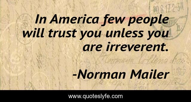 This page presents the quote "In America few people will trust you unless you are irreverent.". Author of this quote is Norman Mailer. This quote is about america, people,.