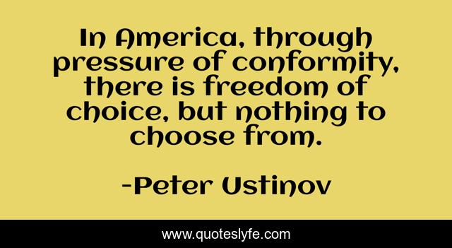 This page presents the quote "In America, through pressure of conformity, there is freedom of choice, but nothing to choose from.". Author of this quote is Peter Ustinov. This quote is about pressure, america, choice,.