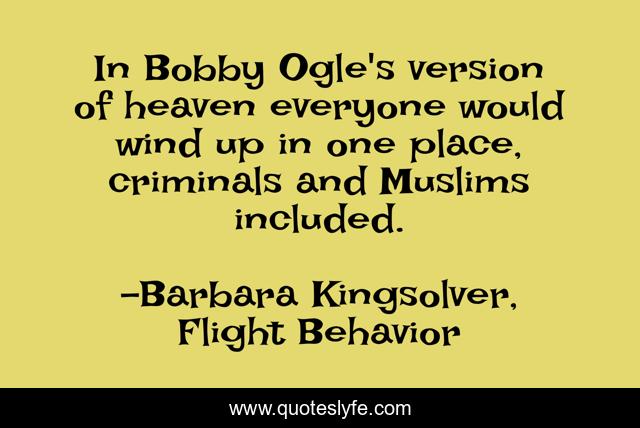 This page presents the quote "In Bobby Ogle's version of heaven everyone would wind up in one place, criminals and Muslims included.". Author of this quote is Barbara Kingsolver, Flight Behavior. .