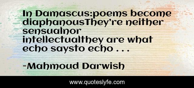 This page presents the quote "In Damascus:poems become diaphanousThey’re neither sensualnor intellectualthey are what echo saysto echo . . .". Author of this quote is Mahmoud Darwish. This quote is about mahmoud-darwish, the-butterfly-s-burden, echo, the-damascene-collar-of-the-dove, poems,.