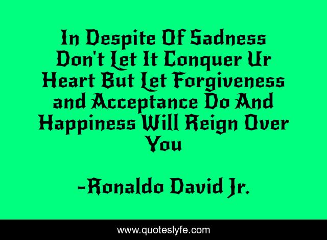 This page presents the quote "In Despite Of Sadness Don't Let It Conquer Ur Heart But Let Forgiveness and Acceptance Do And Happiness Will Reign Over You". Author of this quote is Ronaldo David Jr.. .