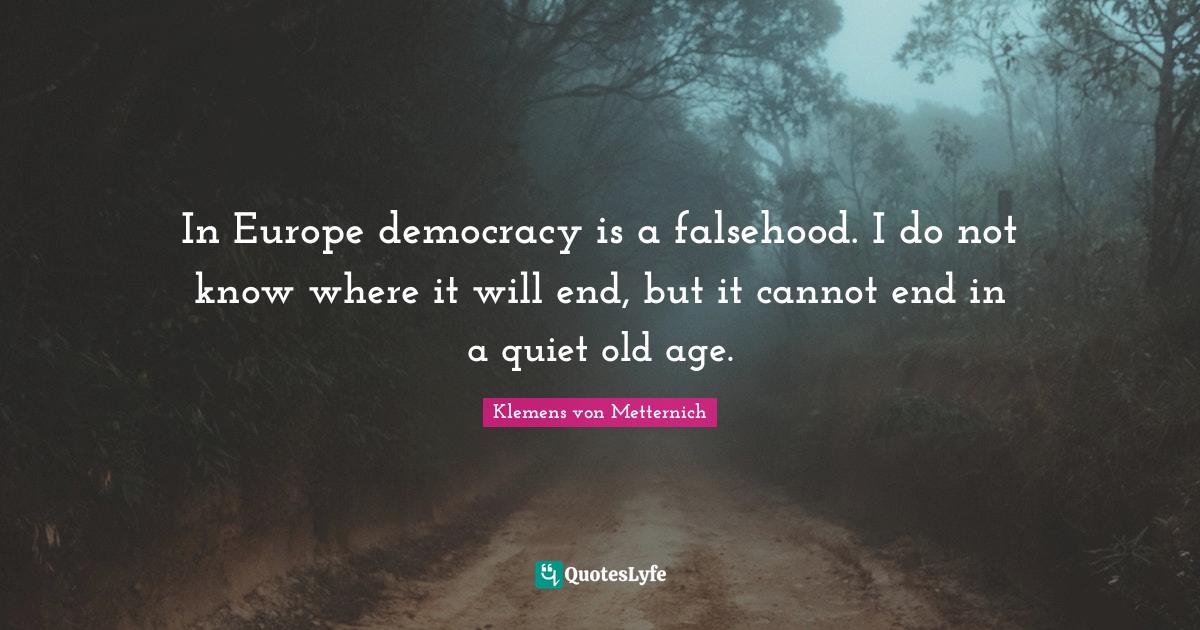 This page presents the quote "In Europe democracy is a falsehood. I do not know where it will end, but it cannot end in a quiet old age.". Author of this quote is Klemens von Metternich. This quote is about falsehood, government, europe, old age, democracy, quiet,.