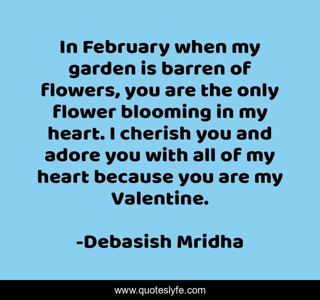 This page presents the quote "In February when my garden is barren of flowers, you are the only flower blooming in my heart. I cherish you and adore you with all of my heart because you are my Valentine.". Author of this quote is Debasish Mridha. This quote is about valentine-s-day, i-cherish-you, i-adore-you, quotes, philosophy, debasish-mridha, valentine-s-day-sayings, debasish-mridha-md, inspirational,.