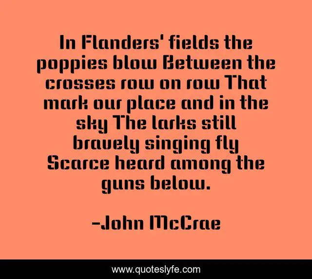 This page presents the quote "In Flanders' fields the poppies blow Between the crosses row on row That mark our place and in the sky The larks still bravely singing fly Scarce heard among the guns below.". Author of this quote is John McCrae. .
