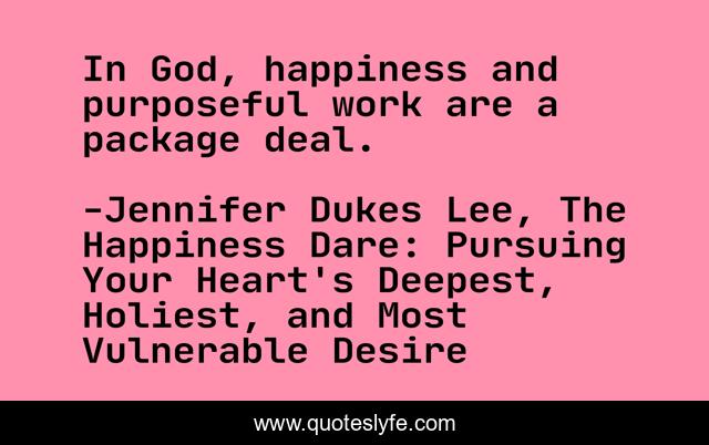 This page presents the quote "In God, happiness and purposeful work are a package deal.". Author of this quote is Jennifer Dukes Lee, The Happiness Dare: Pursuing Your Heart's Deepest, Holiest, and Most Vulnerable Desire. This quote is about god, work, happiness, christianity,.