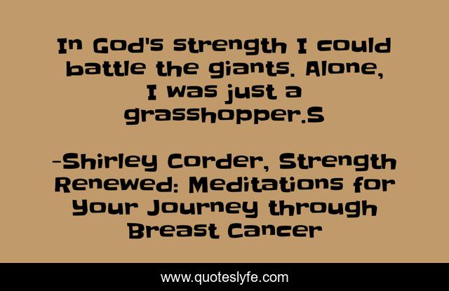 This page presents the quote "In God's strength I could battle the giants. Alone, I was just a grasshopper.S". Author of this quote is Shirley Corder, Strength Renewed: Meditations for Your Journey through Breast Cancer. This quote is about difficult-times, enthusiasm, cancer, inspirational,.