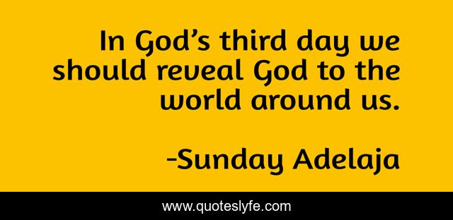 This page presents the quote "In God’s third day we should reveal God to the world around us.". Author of this quote is Sunday Adelaja. This quote is about gods, third-day, reveal,.