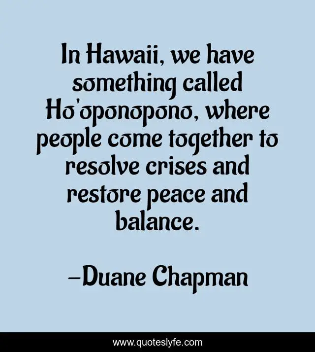 This page presents the quote "In Hawaii, we have something called Ho'oponopono, where people come together to resolve crises and restore peace and balance.". Author of this quote is Duane Chapman. This quote is about balance, together, people,.