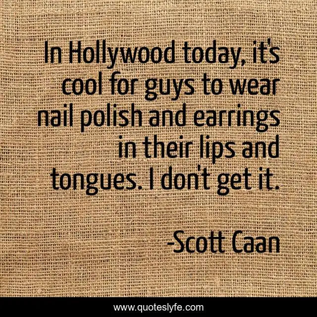 This page presents the quote "In Hollywood today, it's cool for guys to wear nail polish and earrings in their lips and tongues. I don't get it.". Author of this quote is Scott Caan. This quote is about lips, hollywood, today,.