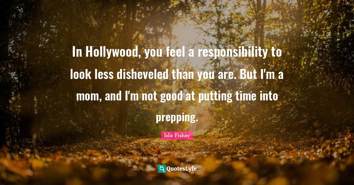 This page presents the quote "In Hollywood, you feel a responsibility to look less disheveled than you are. But I'm a mom, and I'm not good at putting time into prepping.". Author of this quote is Isla Fisher. This quote is about hollywood, responsibility, time, mom,.