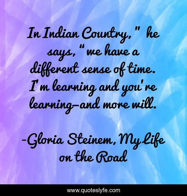 This page presents the quote "In Indian Country, ” he says, “we have a different sense of time. I’m learning and you’re learning—and more will.". Author of this quote is Gloria Steinem, My Life on the Road. This quote is about native-american, learning, time,.