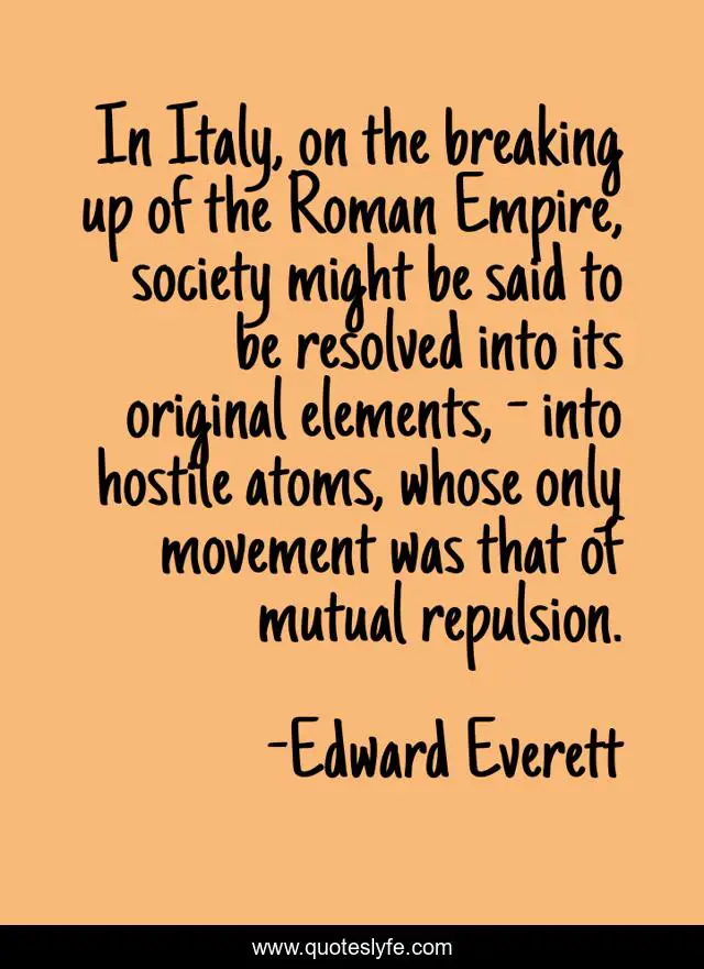 This page presents the quote "In Italy, on the breaking up of the Roman Empire, society might be said to be resolved into its original elements, - into hostile atoms, whose only movement was that of mutual repulsion.". Author of this quote is Edward Everett. This quote is about empire, said, italy,.