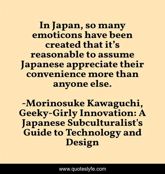 "Morinosuke Kawaguchi, Geeky-Girly Innovation: A Japanese Subculturalist's Guide to Technology and Design Quotes." Quoteslyfe.com, 2025. Fri. 05 Dec. 2025. <https://www.quoteslyfe.com/quote/In-Japan-so-many-emoticons-have-been-137609>.