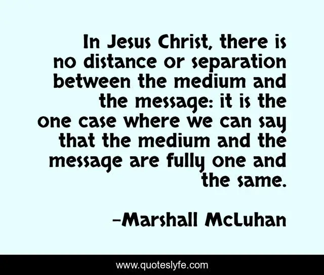 This page presents the quote "In Jesus Christ, there is no distance or separation between the medium and the message: it is the one case where we can say that the medium and the message are fully one and the same.". Author of this quote is Marshall McLuhan. This quote is about christianity, message, medium, christ, jesus,.