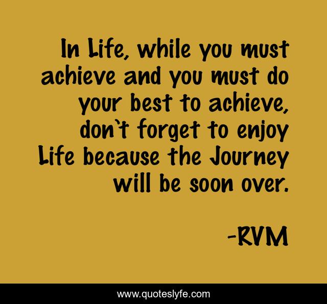 This page presents the quote "In Life, while you must achieve and you must do your best to achieve, don’t forget to enjoy Life because the Journey will be soon over.". Author of this quote is RVM. This quote is about motivation, inspiration,.