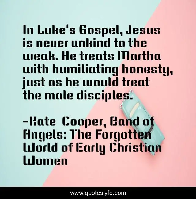 This page presents the quote "In Luke's Gospel, Jesus is never unkind to the weak. He treats Martha with humiliating honesty, just as he would treat the male disciples.". Author of this quote is Kate Cooper, Band of Angels: The Forgotten World of Early Christian Women. This quote is about jesus, gospel-of-luke, women,.