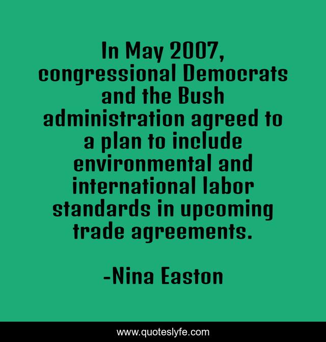 This page presents the quote "In May 2007, congressional Democrats and the Bush administration agreed to a plan to include environmental and international labor standards in upcoming trade agreements.". Author of this quote is Nina Easton. This quote is about may, plan, labor,.