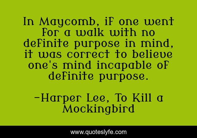 This page presents the quote "In Maycomb, if one went for a walk with no definite purpose in mind, it was correct to believe one's mind incapable of definite purpose.". Author of this quote is Harper Lee, To Kill a Mockingbird. .