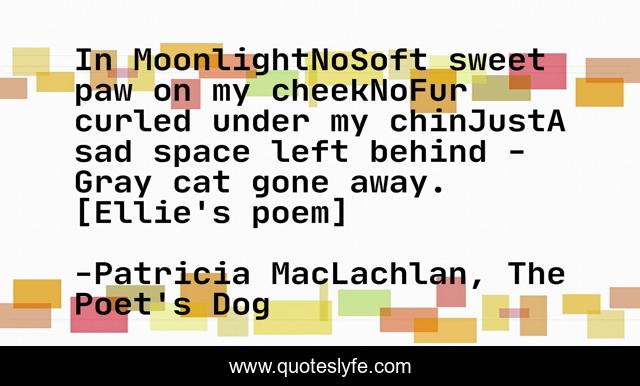This page presents the quote "In MoonlightNoSoft sweet paw on my cheekNoFur curled under my chinJustA sad space left behind - Gray cat gone away. [Ellie's poem]". Author of this quote is Patricia MacLachlan, The Poet's Dog. This quote is about cats, poetry, sad,.