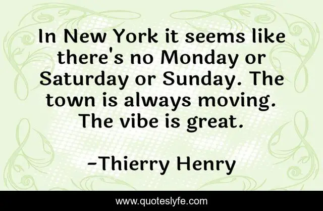 This page presents the quote "In New York it seems like there's no Monday or Saturday or Sunday. The town is always moving. The vibe is great.". Author of this quote is Thierry Henry. This quote is about new york, moving, monday,.