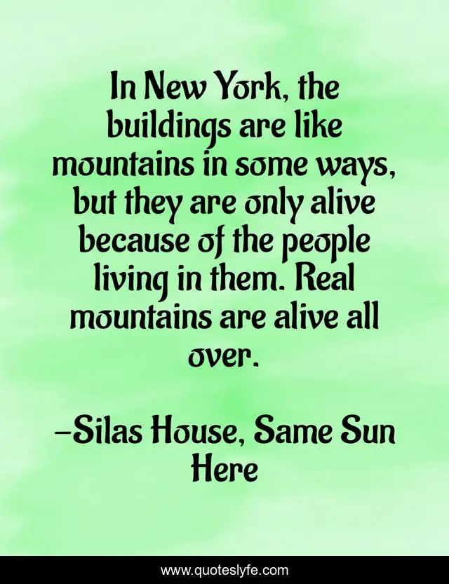 This page presents the quote "In New York, the buildings are like mountains in some ways, but they are only alive because of the people living in them. Real mountains are alive all over.". Author of this quote is Silas House, Same Sun Here. This quote is about mountains, new-york-city,.