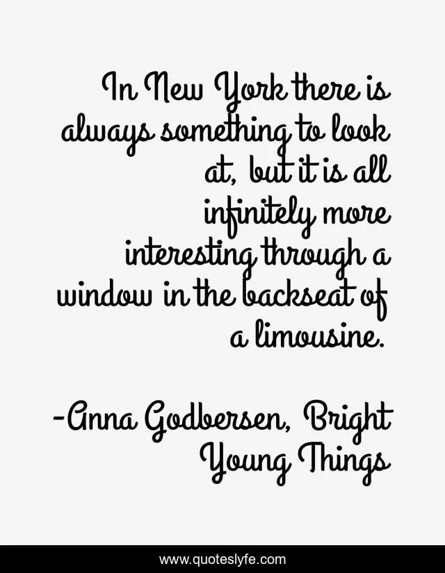 This page presents the quote "In New York there is always something to look at, but it is all infinitely more interesting through a window in the backseat of a limousine.". Author of this quote is Anna Godbersen, Bright Young Things. This quote is about city, anna-godbersen, flapper, new-york, bright-young-things, limousine,.