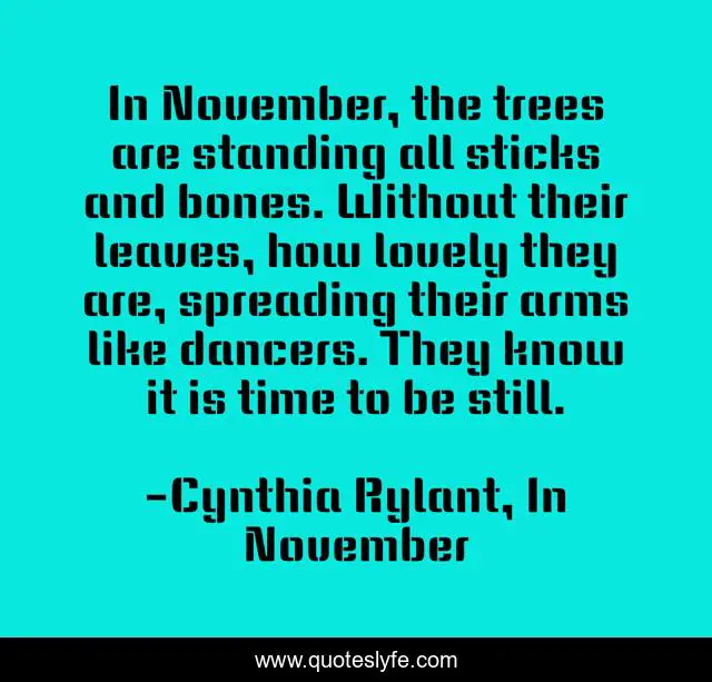 "Cynthia Rylant, In November Quotes." Quoteslyfe.com, 2025. Fri. 05 Dec. 2025. <https://www.quoteslyfe.com/quote/In-November-the-trees-are-standing-all-256892>.